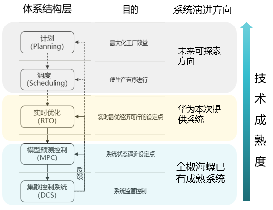 基于5G+工業(yè)互聯(lián)網(wǎng)思路和降低碳排放的需求,進一步改善現(xiàn)有系統(tǒng)的自動程度與能耗優(yōu)化能力,在現(xiàn)有MPC系統(tǒng)之上建設(shè)水泥燒成及原料粉磨能耗優(yōu)化系統(tǒng)(RTO)。該系統(tǒng)是一個基于原水泥窯、磨MPC系統(tǒng)之上的工藝參數(shù)優(yōu)化系統(tǒng)(如下圖所示),是對現(xiàn)有成熟MPC系統(tǒng)的進一步優(yōu)化,最終實現(xiàn)對窯、磨系統(tǒng)的穩(wěn)定且低耗的自動駕駛,能夠有效降低CO2排放,提升生產(chǎn)效率。