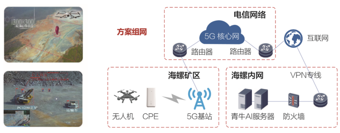 無人機通過5G 將監(jiān)控到的礦場高清視頻傳送到天翼云上AI平臺進行分析,當分析到爆破范圍內(nèi)有人或者設(shè)備,AI系統(tǒng)將通過一體化AI平臺進行報警,爆破完成后,無人機采集地形變化,更新3D模型,指導后續(xù)爆破和開采。