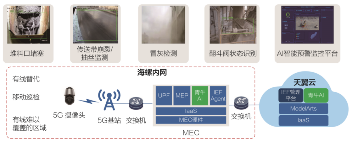 利用5G的大帶寬、高可靠性特點,對水泥制造和園區(qū)安全,生產(chǎn)過程中需要人力監(jiān)控的點進行了判斷,通過AI開發(fā)出專門算法,在堆料口堵塞,傳動帶崩裂檢測,冒灰污染檢測,翻斗閥檢測等方式進行了機器視覺應(yīng)用開發(fā),同時針對園區(qū)人員不安全行為,也都增加了AI 安全檢測,當報警達到閾值,或AI識別出人員不安全行為,會實時告警。
