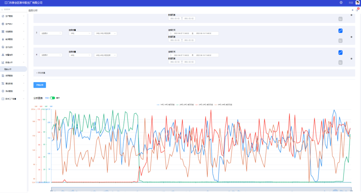 新華膠絲廠能效分析具有強(qiáng)大的歷史能耗數(shù)據(jù)追溯和分析功能,多維度分析企業(yè)不同生產(chǎn)區(qū)域/設(shè)備的能耗、能效水平及產(chǎn)量,可隨時(shí)查看某個(gè)區(qū)域/設(shè)備、時(shí)間、班組的能耗、能效、產(chǎn)量波動(dòng)情況,通過動(dòng)態(tài)的圖形顯示,快速了解是否有異常情況,從而對生產(chǎn)、管理、工藝及時(shí)進(jìn)行指導(dǎo)和調(diào)整,使新華膠絲廠生產(chǎn)過程的單位能耗和能源效率保持在科學(xué)、合理水平。