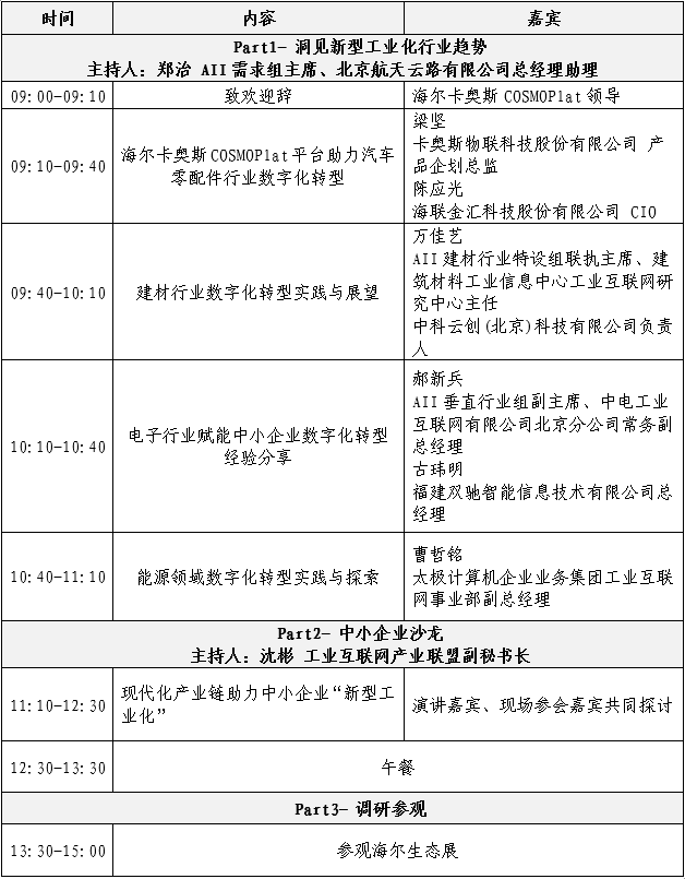 本月26日,AII將聯合海爾卡奧斯COSMOPlat共同舉辦“我為企業辦實事”系列活動——工業互聯網垂直行業融通創新沙龍。本次沙龍邀請到了家電行業、建材行業、電子行業、能源行業的代表企業卡奧斯、建材工業信息中心、中國電子、太極集團負責人分享行業經驗,共同探討現代化產業鏈如何賦能中小企業“新型工業化”的熱門話題?;顒影才啪唧w如下:
