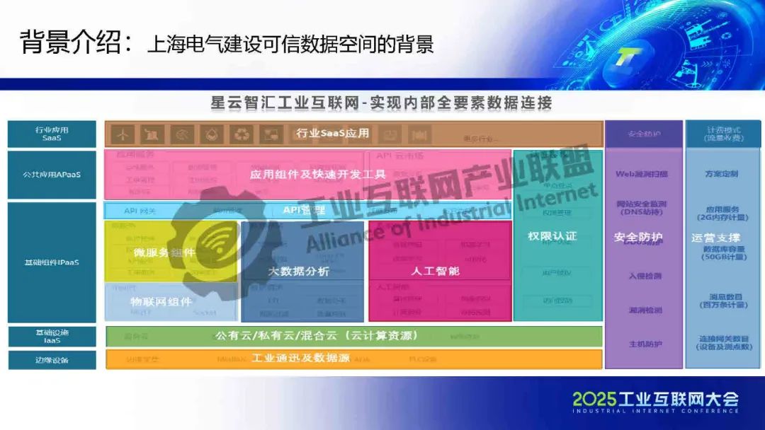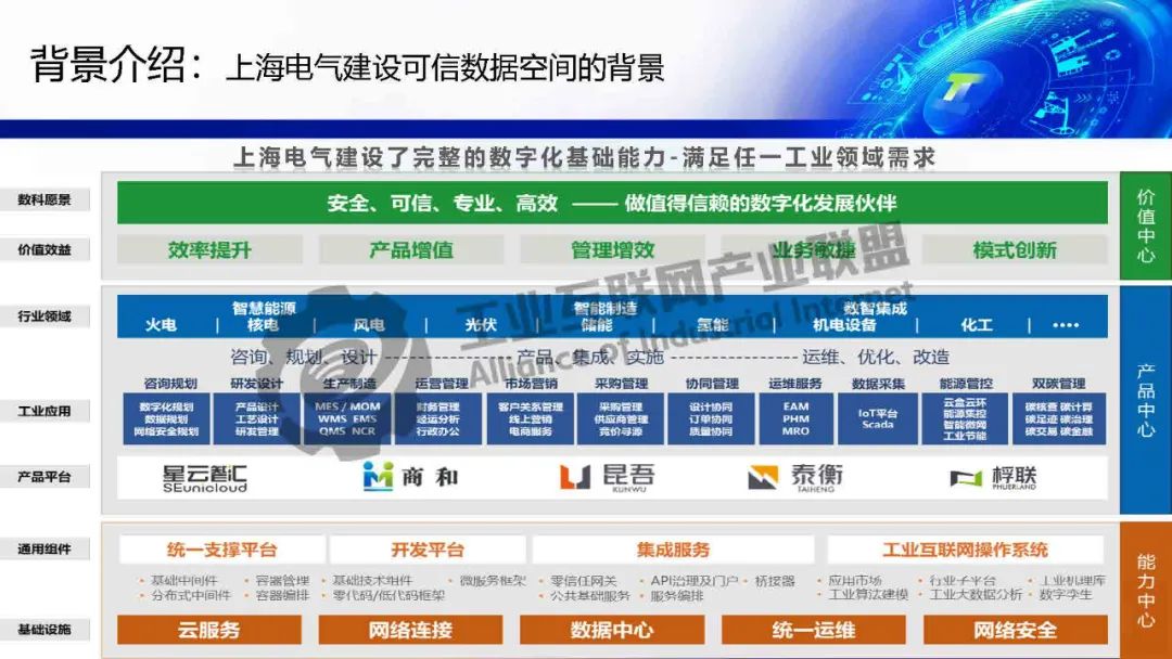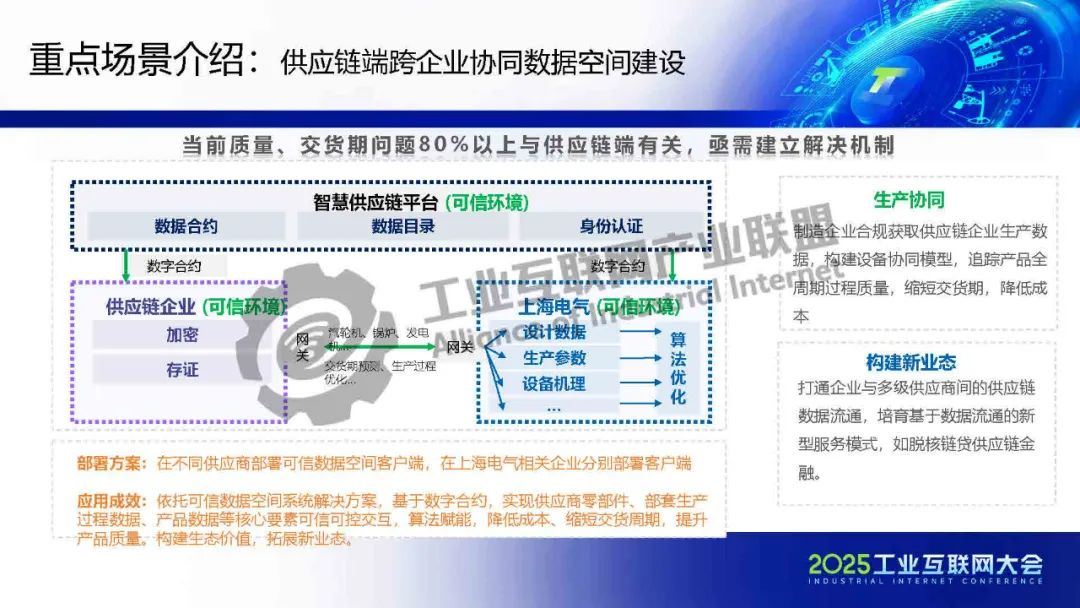 黃猛介紹,可信數(shù)據(jù)空間作為重要的數(shù)據(jù)流通基礎設施,依托上海電氣在能源和工業(yè)裝備領域的全產業(yè)門類及豐富數(shù)據(jù)場景,構建了數(shù)字化基礎能力,包括星云智匯工業(yè)互聯(lián)網和智慧供應鏈平臺,實現(xiàn)了全要素數(shù)據(jù)連接與跨企業(yè)協(xié)同。該平臺基于工業(yè)互聯(lián)網底座,整合區(qū)塊鏈、隱私計算、身份管理等技術,確保數(shù)據(jù)安全與跨域使用控制。重點應用場景包括能源裝備后運維服務,通過數(shù)據(jù)智能分析提升安全可靠性,并驅動新能源行業(yè)AI應用;以及供應鏈端跨企業(yè)協(xié)同,通過可信數(shù)據(jù)空間解決質量與交貨期問題,實現(xiàn)金融普惠、綠色供應鏈和雙碳目標。