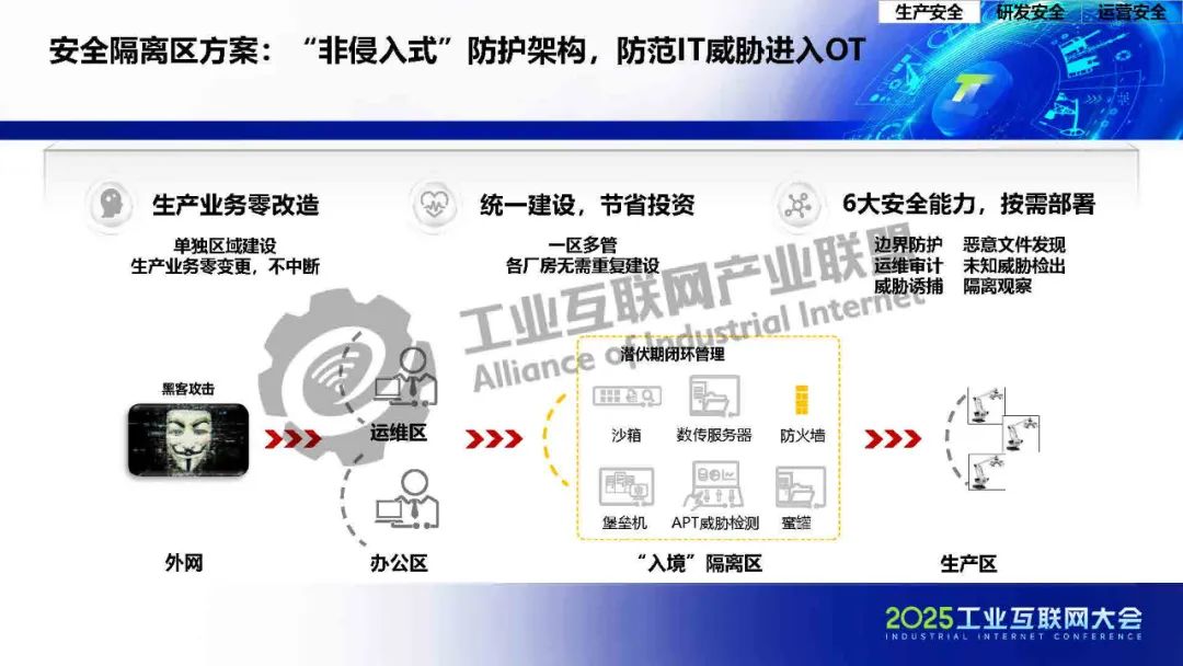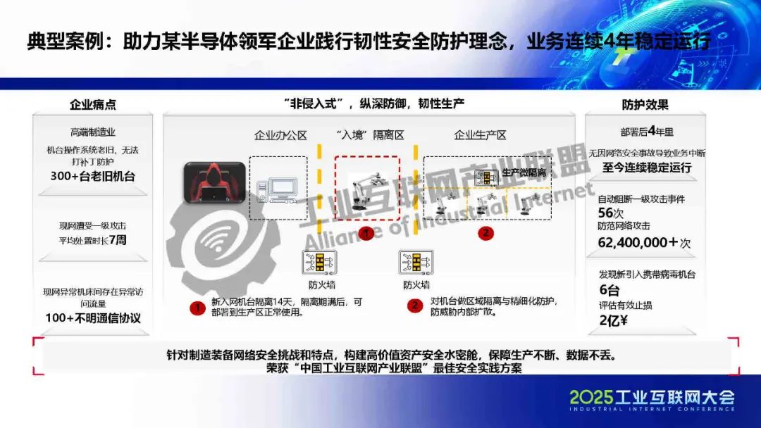 張光明介紹,參考業界安全框架標準,華為結合制造行業特點創新提出三維韌性安全理念。該理念通過內生安全、智能防御和高效運維,結合檢測分析、威脅可視、策略聯動和響應恢復,采用全流程可信設計,關鍵器件100%國產化,達到非侵入式安全隔離區實現IT/OT隔離、機臺微隔離阻斷橫向威脅擴散、業界首創"端網存"聯動防勒索方案、零信任動態授權確保安全接入、AI大模型提升安全運營效率160倍等效果,已助力某半導體企業實現4年業務零中斷,累計防御攻擊超6240萬次。華為方案獲得Gartner等權威機構認可,實現"生產不斷、數據不丟"的安全目標。