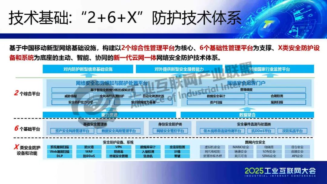 王君誠介紹,在國際形勢復雜多變的動蕩環境下,工業互聯網網絡安全風險持續增加,呈現攻擊目標化與復雜化、漏洞隱患日益突出、新型風險不斷涌現等特點,工業互聯網網絡安全監管與預警體系亟需建立和完善。中國移動“2+6+X”防護技術體系是基于中國移動新型網絡基礎設施,構建以2個綜合性管理平臺為核心、6個基礎性管理平臺為支撐、X類安全防護設備和系統為底座的主動、智能、協同的新一代云網一體網絡安全防護技術體系。