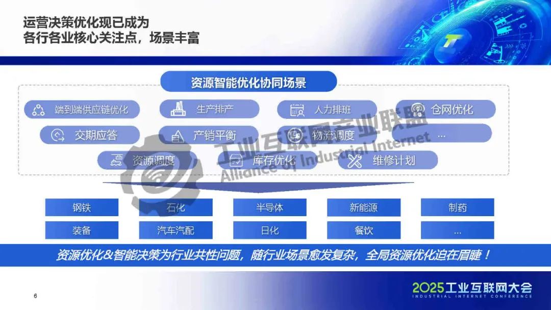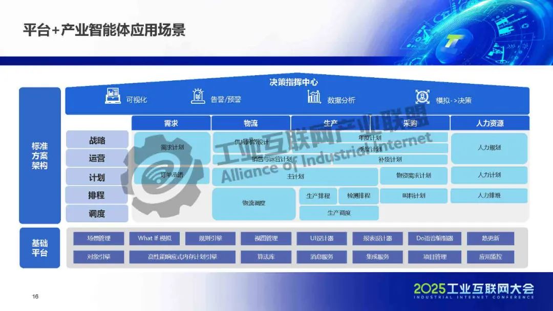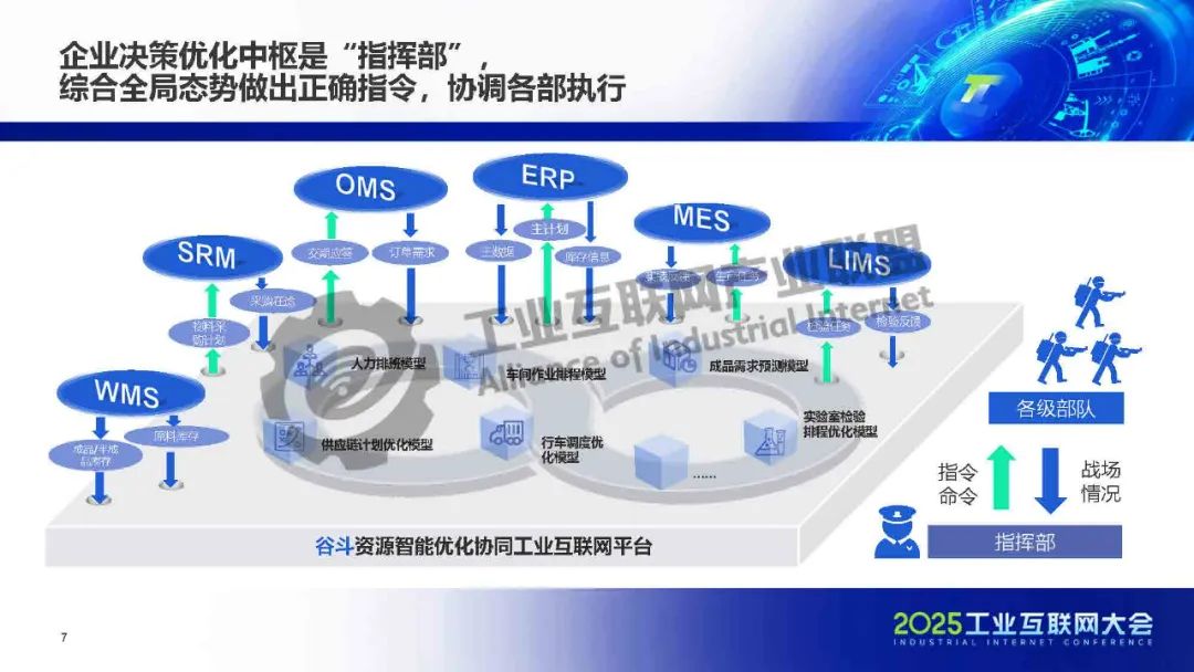 企業決策優化中樞可比作"指揮部",通過其資源智能優化協同工業互聯網平臺整合ERP、SRM、WMS等各業務系統數據,形成全局態勢感知。該平臺包含成品需求預測、供應鏈計劃優化、車間作業指揮等專業模型,像指揮部一樣綜合分析生產任務、設備流程、實驗室檢驗等"戰場情況",生成最優指令并協調各部門執行。這種"指揮-部隊"協同模式實現了從主計劃到具體作業的全鏈路智能決策,有效提升了企業在復雜業務環境下的資源優化和協同效率。