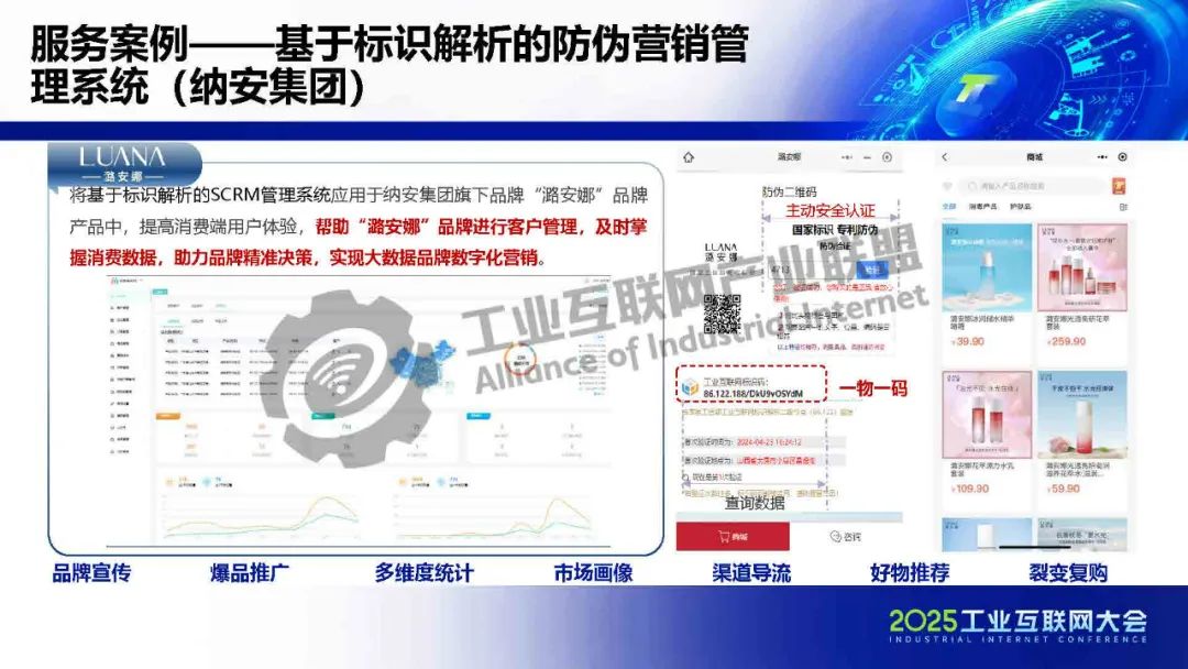 霍健介紹,工業(yè)互聯(lián)網(wǎng)唯一標(biāo)識碼可以關(guān)聯(lián)產(chǎn)品生產(chǎn)端至銷售端全流程信息,還可讓每一件產(chǎn)品成為品牌流量入口,變成移動(dòng)的廣告牌,實(shí)現(xiàn)品牌精準(zhǔn)營銷、裂變復(fù)購等功能,提高產(chǎn)品競爭力,有力保護(hù)消費(fèi)者的利益,增強(qiáng)消費(fèi)者對產(chǎn)品的信任度,實(shí)現(xiàn)全渠道復(fù)購增購。將基于標(biāo)識解析的SCRM管理系統(tǒng)應(yīng)用于產(chǎn)品中,可以提高消費(fèi)端用戶體驗(yàn),幫助品牌進(jìn)行客戶管理,及時(shí)掌握消費(fèi)數(shù)據(jù),助力品牌精準(zhǔn)決策,實(shí)現(xiàn)大數(shù)據(jù)品牌數(shù)字化營銷。