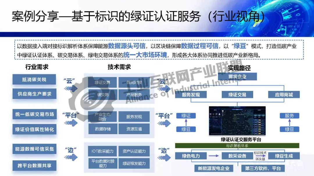 基于標識的綠證認證服務通過對接國家工業(yè)互聯(lián)網標識解析體系,打通光伏行業(yè)設備資產可信采集傳輸鏈條,創(chuàng)建異構光伏設備的統(tǒng)一數據模板,為分布式光伏設備頒發(fā)全球唯一且不可篡改的標識數字身份證,生成光伏行業(yè)產品可信資產標識,實現(xiàn)分布式光伏能源行業(yè)的可信資產管理、定位和監(jiān)測。