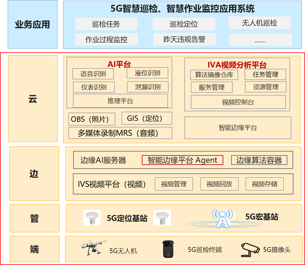 (3)借助5G專網超級上行,作業違規算法下沉邊緣AI服務器,借助AI算法,用音視頻記錄儀監控,并自動識別主要7類違規作業行為。