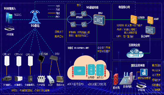 如上圖所示,5G MEC企業專網以5G數據分流技術為基礎,通過無線和控制網元的靈活定制,構建一張增強帶寬、低時延、數據不出園的基礎連接網絡。核心網用戶面網元UPF為園區私有化部署,根據生產區域需求可靈活部署無線基站,提供物理獨享的5G專用網絡。
