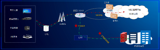 園區新增部署5G核心網用戶面網元UPF、STN接入點及5G基站,采用SA組網架構,UPF經2*10GE口字型上聯園區C10 A2節點,實現UPF與5GC及基站的組網: ① 控制面及網管流:通過STN接至城域ER,經5GC CE接入5GC核心網 ;② UPF-基站:通過C10 A2接入園區gNR基站。