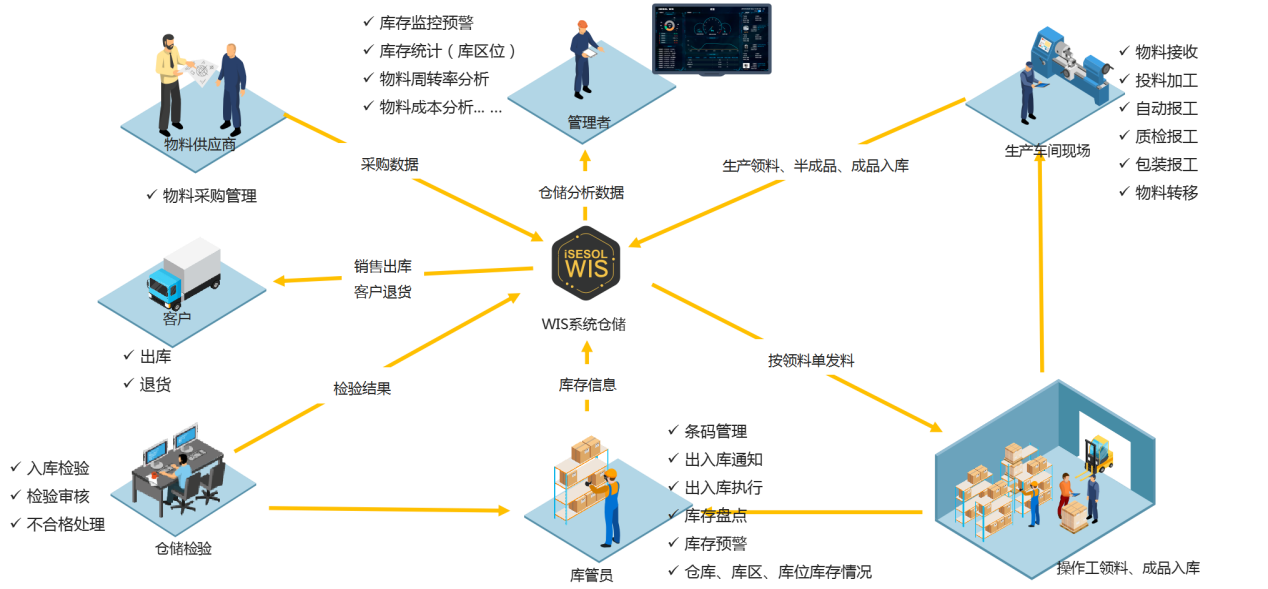 3)企業倉庫通過進銷存軟件進行管理,只能管理物料庫存,無先進先出提醒,無安全庫存預警,存在貨實不符情況。無法實現庫區庫位精細管理。在生產計劃下發后,無法有效的實現物料劃分或分配占用,影響計劃準確性。