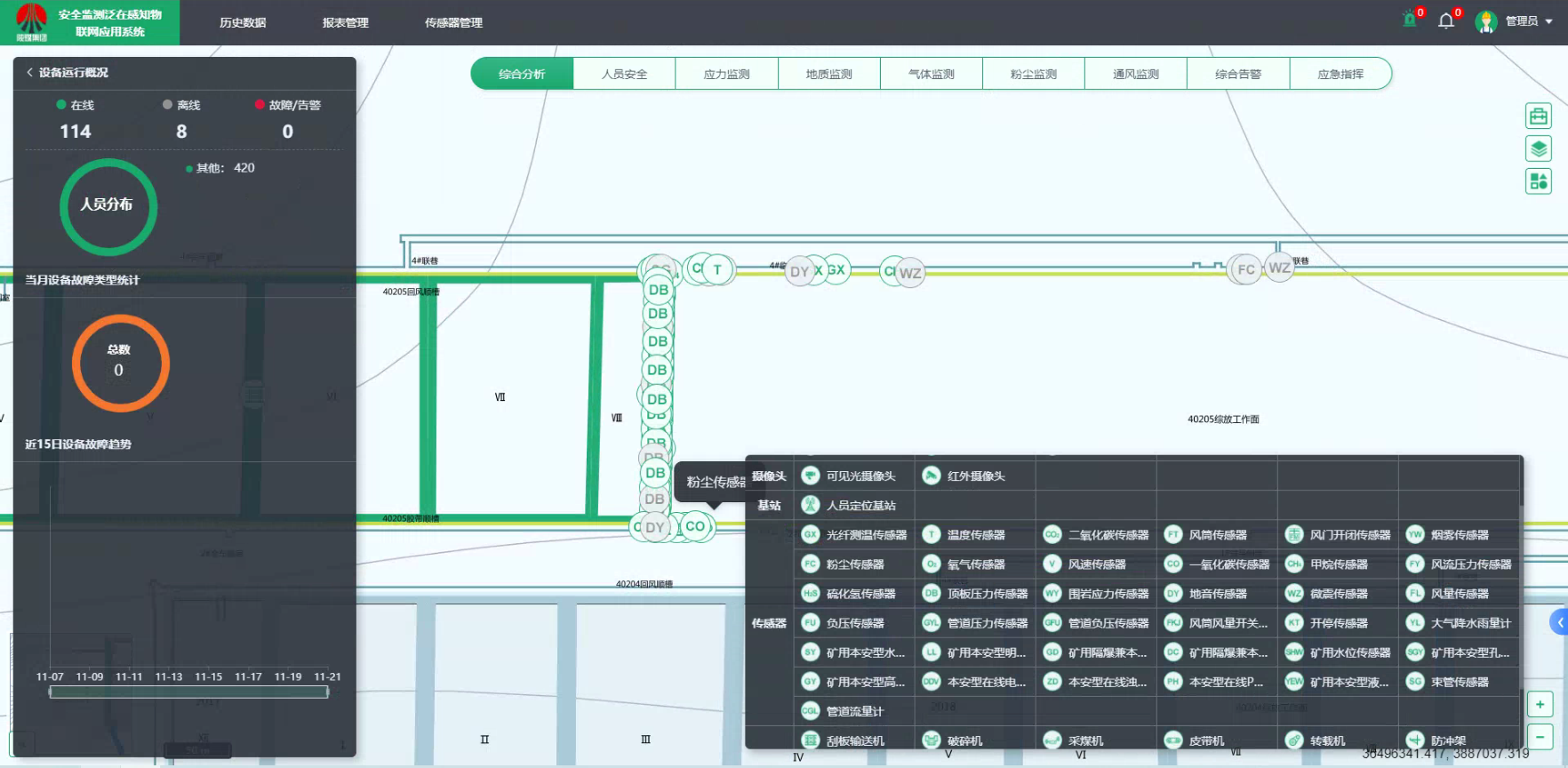 建設智能綜合防塵系統,實現對井下粉塵濃度的實時監測、數據分析、上傳及超限自動報警,在礦井粉塵易超限區域建設呼吸性粉塵及總塵監測設備、智能噴霧裝置及智能降塵裝置,實現粉塵濃度智能監測及遠程降塵控制。