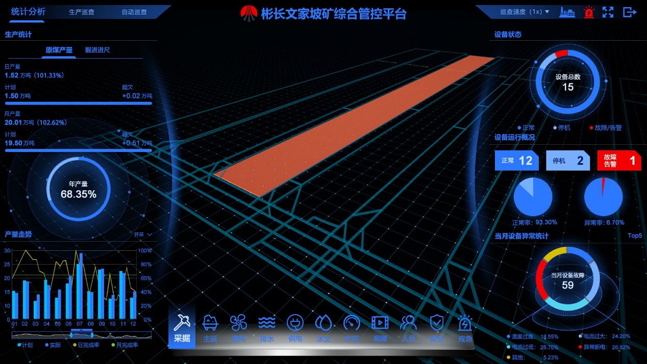 利用“數字化”、“網絡化”和“智能化”的智慧礦山實施路徑,形成“1+1+1+1+N”模式,即1個基礎、1朵云(混合云)、1個信息共享綜合管控平臺、1個生產一體化協同平臺和N個應用(智能綜合管控的生產執行系統、經營管理系統、決策支持系統、安全管理系統、遠程監控及維護系統、統計分析與預測系統、移動智能終端APP)的智能礦井,實現生產智能監控、設備智能管理與監控、安全智能監控、應急智能指揮、風險分級預警與隱患排查、綜合集團駕駛艙、報表統計、數字孿生與仿真等。