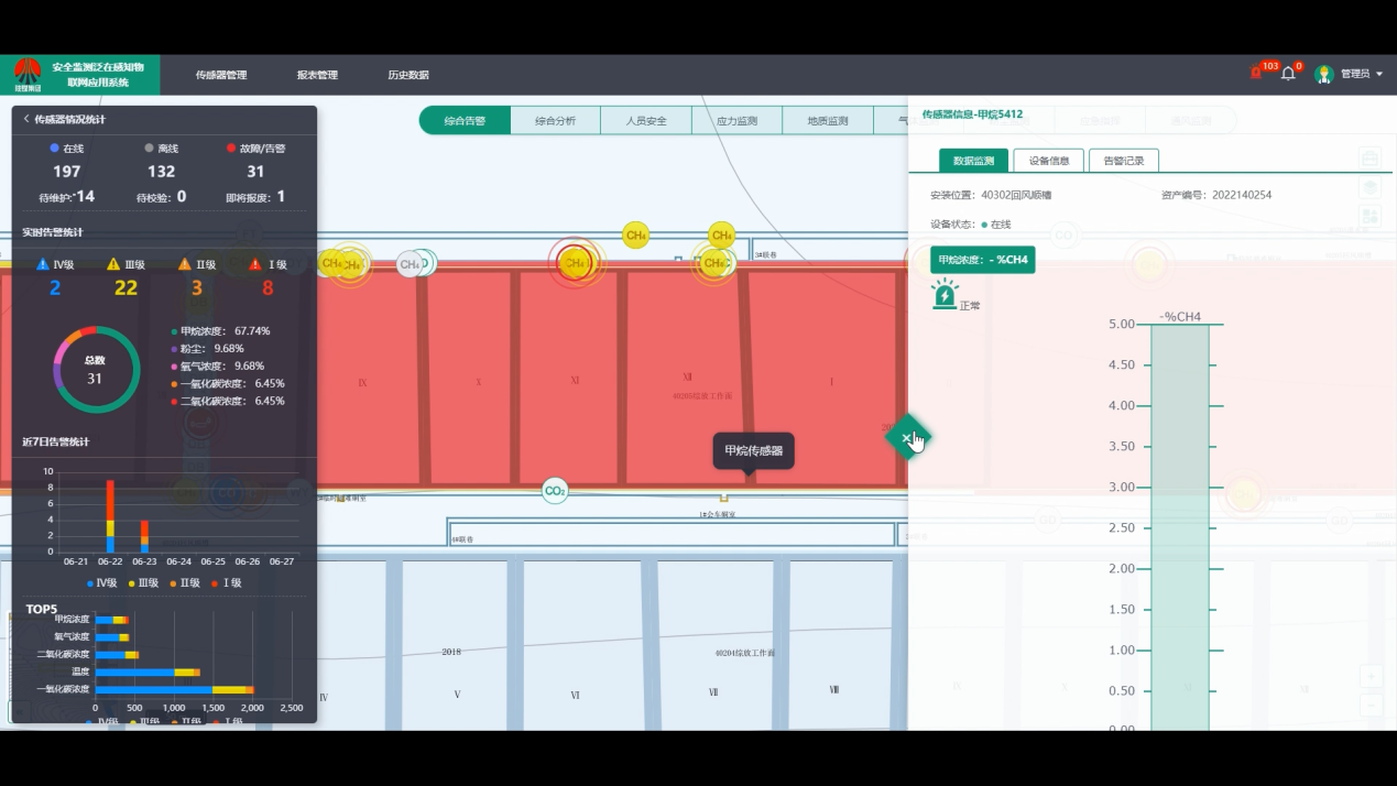 安全環境中氧氣、粉塵、一氧化碳、甲烷、硫化氫、二氧化碳等信息無線采集的全方位實時監測及預控。