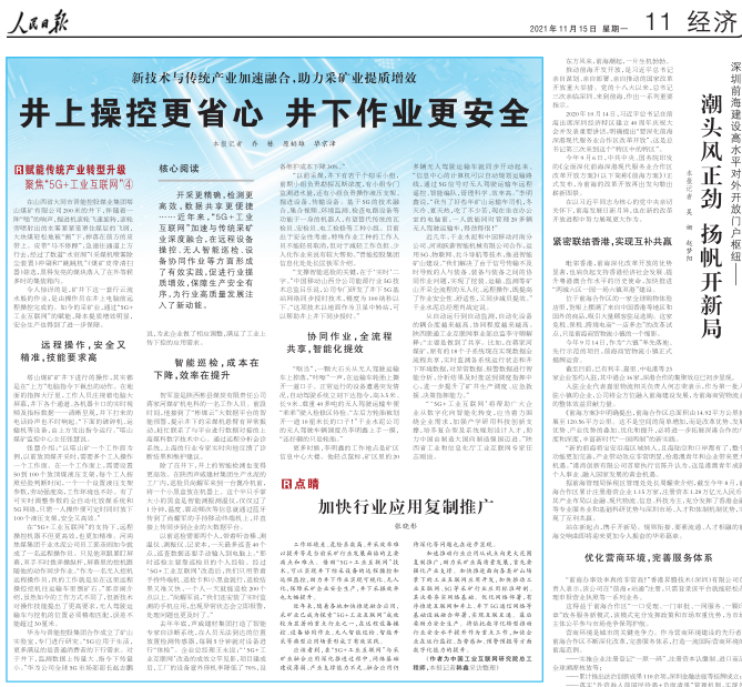 陜西陜煤彬長小莊礦業公司隸屬于陜煤集團,是集團“5G+智慧礦區”試點單位,設計能力600萬噸/年。小莊礦業立足中標的2020年工業和信息化部工業互聯網創新發展工程,通過安全風險分級分類和分析預警、井下危險區域實時監測、生產設備全生命周期管理和故障識別、礦井人員追蹤管理等落地驗證。提供了可靠的面向國家礦山能源多元災害環境的工業互聯網+安全生產解決方案。11月15日人民日報對陜煤彬長礦區安全生產成績做了報道。