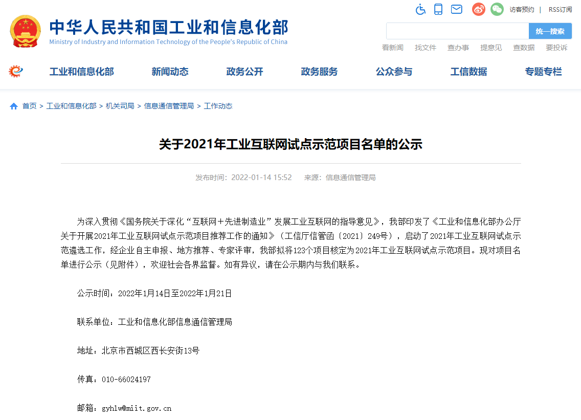 該項目榮獲工信部2021年“工業互聯網試點示范項目”工業互聯網+安全生產解決方案示范。