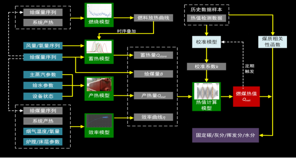 燃煤作為熱電廠最主要的原料,是影響熱電廠控制的關(guān)鍵。燃煤作為天然礦物其成份是不均勻的,而且大多數(shù)熱電廠都需要將多種來源的燃煤進行摻配使用,所以實時入爐的燃煤品質(zhì)是波動的。目前還沒有有效的技術(shù)對燃煤成份進行在線實時檢測,所以燃煤成份都是通過抽樣離線化驗獲得的。當(dāng)煤質(zhì)發(fā)生較大變化時,缺乏煤質(zhì)的及時感知會導(dǎo)致控制不穩(wěn)定的問題。如下是一套煤質(zhì)軟測量的原理圖: