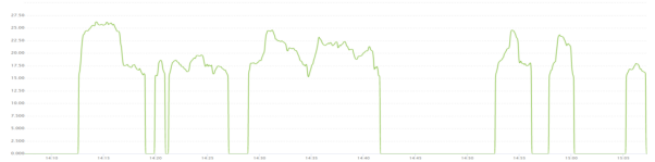 蒸汽和水的流量在熱電控制中也非常重要,但許多流量計在流量低于一定量后容易進入流量計的檢測死區(qū),出現(xiàn)測量值歸零的現(xiàn)象,如下圖所示,當(dāng)流量低于15噸時測量值直接歸零: