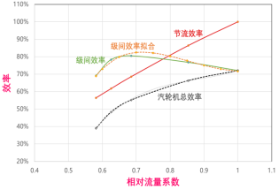 熱電廠的汽機大多采用節(jié)流方式對汽機負荷進行調(diào)整,節(jié)流方式會導(dǎo)致蒸汽能量的損失。而熱電由于蒸汽負荷波動大,所以汽機負荷會在較大范圍內(nèi)波動。如果主蒸汽壓力不考慮汽機負荷的話,會導(dǎo)致低負荷段的汽機能效損失較大。如下圖展示了汽機總效率的計算原理: