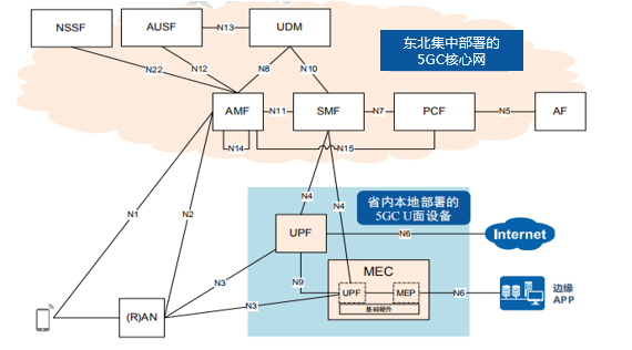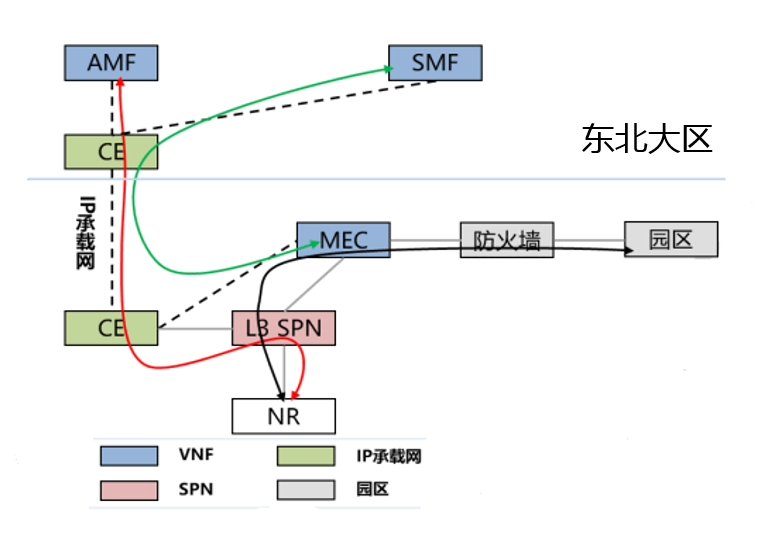 MEC設備部署在企業信息化機房。gNB與AMF間的 N2 接口通過SPN+IP承載網承載。gNB 與邊緣UPF的N3接口通過 SPN 承載。要求與邊緣 UPF對接的SPN提供3層能力。SMF與邊緣UPF間的N4接口采用直連方式,通過SPN+IP承載網互通。邊緣UPF通過IP承載網網管CE與東北大區EMS進行通信。網管接口通過SPN+IP承載網承載。