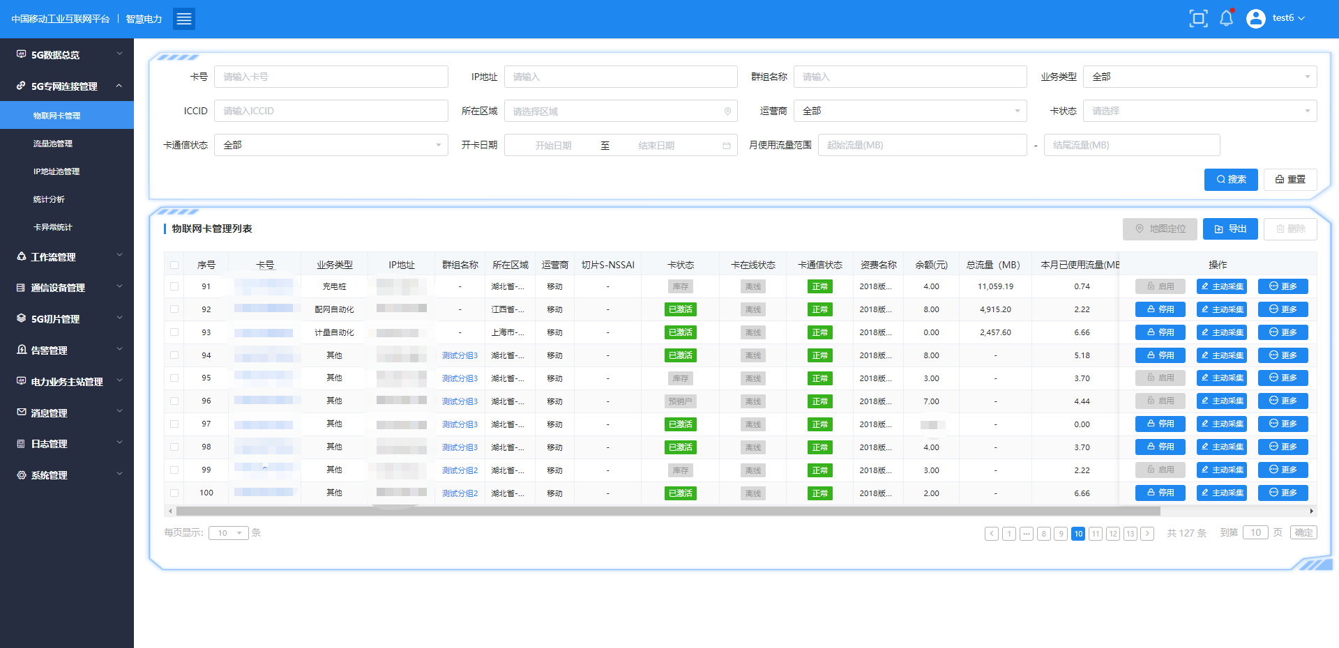 5G電力專網連接管理,可實現對于電力業務中使用的無線通信卡資源的管理,對其進行記錄和統計分析。無線通信卡數據包括IP地址管理、域名管理、卡資費情況、流量使用情況等。目前平臺已接入1萬多張物聯卡,建立卡臺賬、資費等信息,實現物聯網卡的精細化管理。