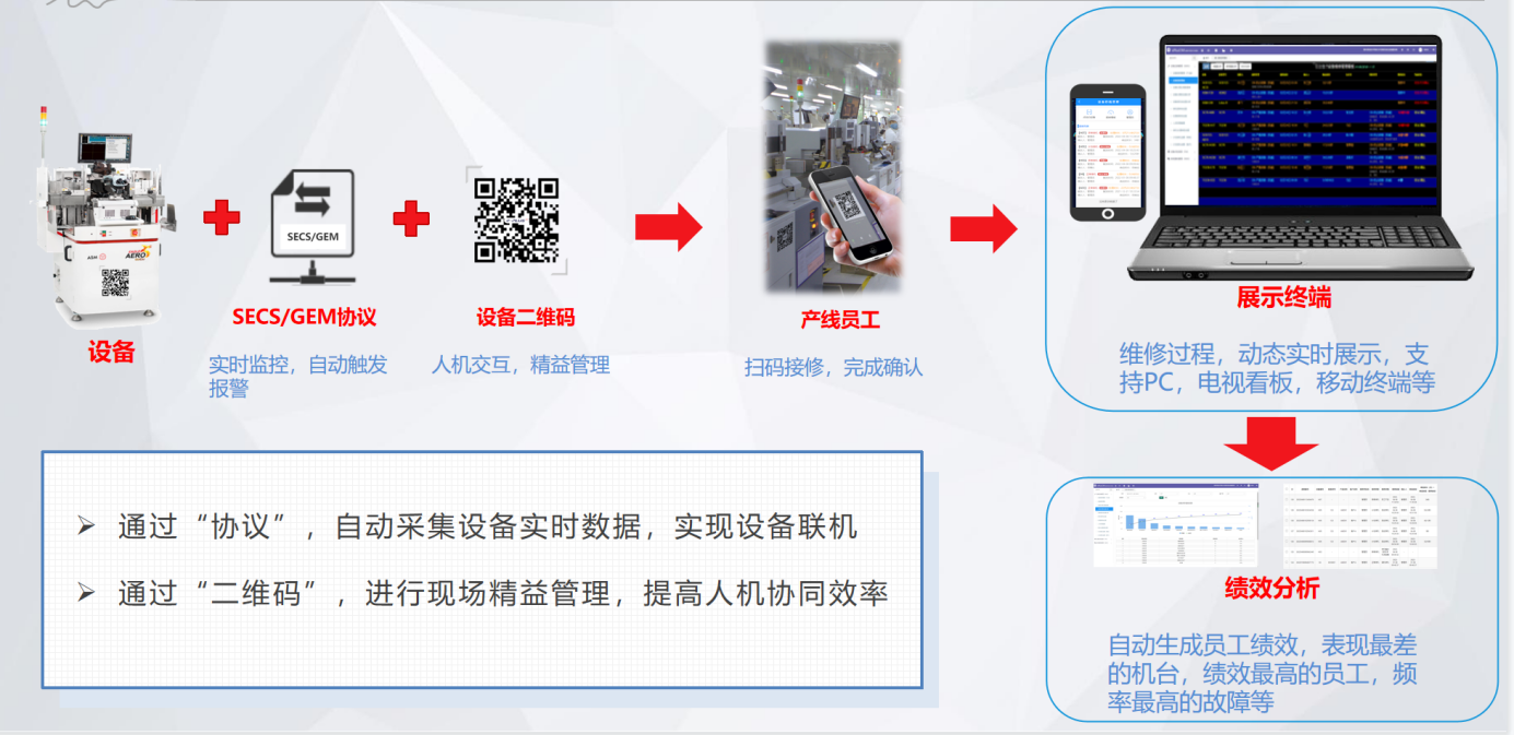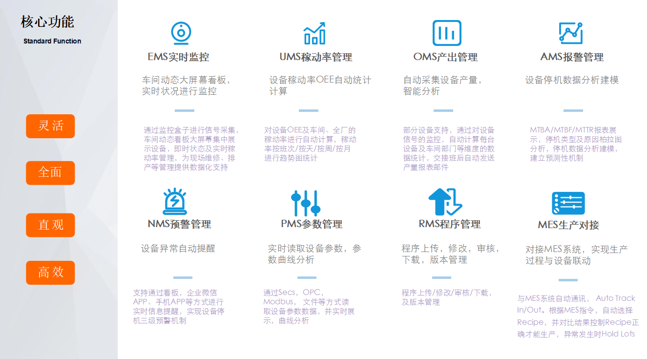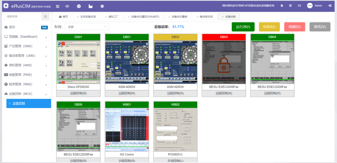 SFA智能控制部分,針對半導體封測設備,采用半導體SECS/GEM通訊協議,通過IoT物聯網架構,實現設備的設備的數據采集與控制,實現RMS配方管理、AMS報警管理、UMS稼動率管理、RCM遠程控制、EAP設備自動化接口等功能。