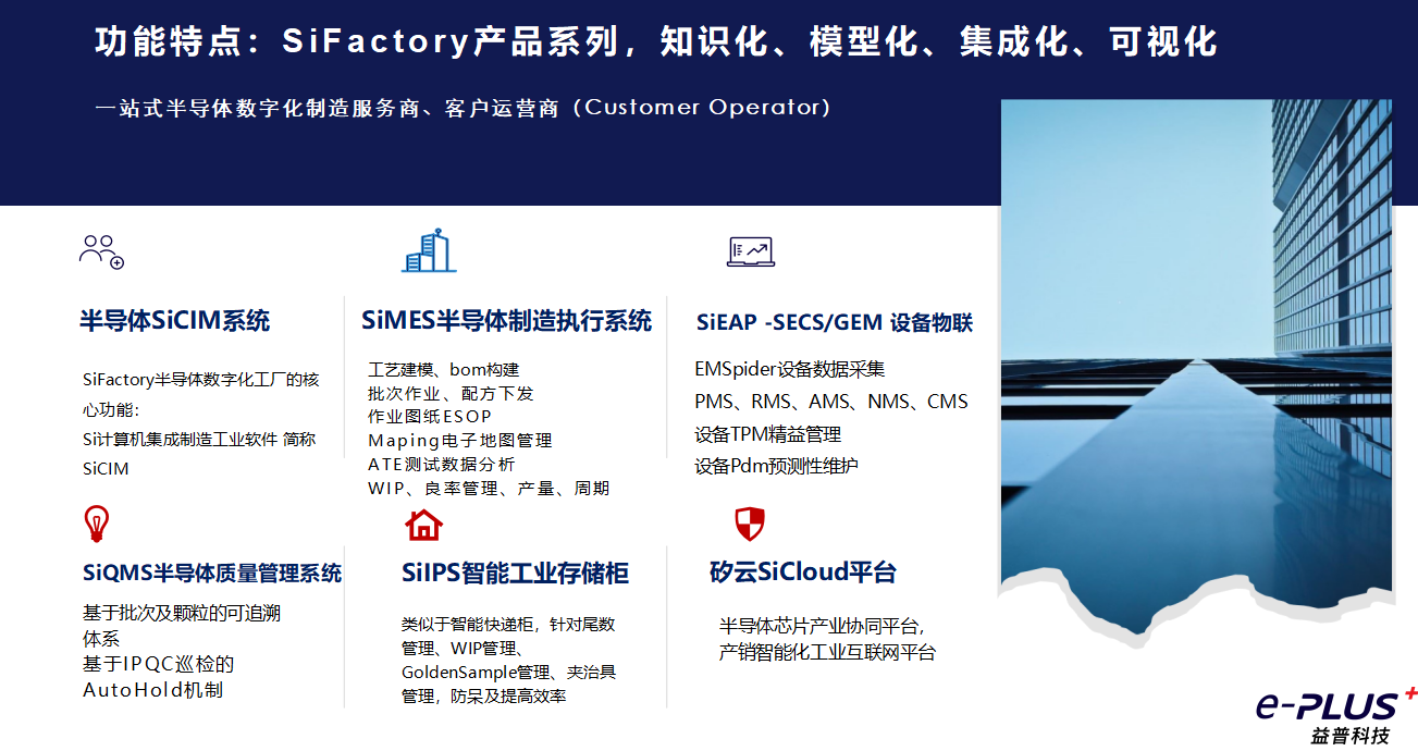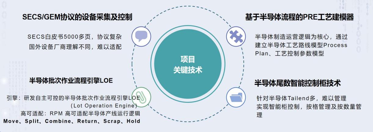 產品打通SECS/GEM半導體專用通信協議,基于工業物聯網及微服務架構,研發半導體智能制造執行系統—“SiFactroy半導體數字化工廠”。