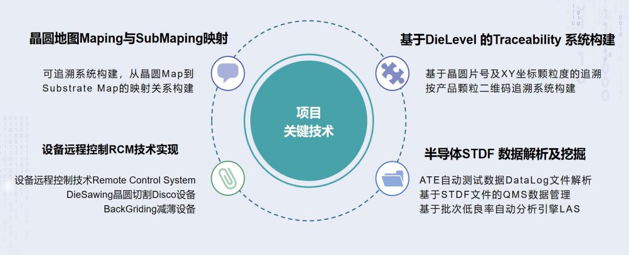 團隊立足自主研發,挑戰行業空白,開發針對于半導體封裝測試行業的“硅芯似箭”SiFactory半導體數字化工廠解決方案。技術創新包括半導體SECS/GEM協議解析,半導體工藝流程PRE建模器,晶圓地圖Maping與SubMaping映射,半導體STDF 數據解析及挖掘以及DieLevel 的Traceability 系統構建等。