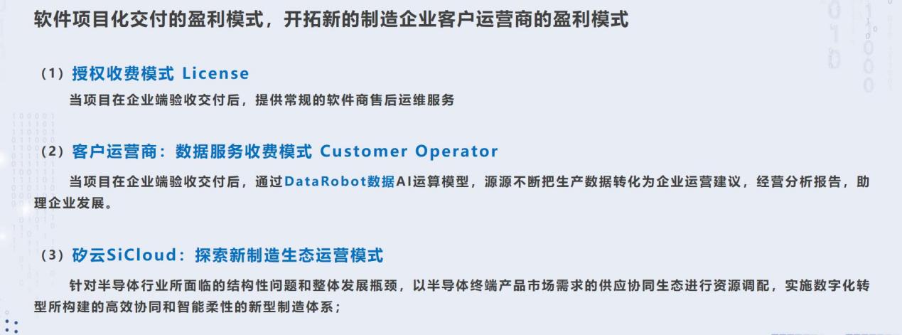 (2)持續在DataRobot數據機器人投入,堅持“數據驅動決策”的理念,通過數據+算法的模式,結合制造管理及工業機理模型,開發更多能分析數據、治理數據、輔助生產決策的行業通用高可復用的工業APP應用。
