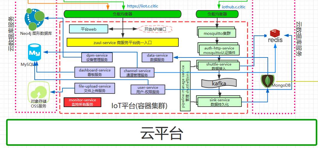 本方案涉及的平臺(tái)是基于業(yè)界開放標(biāo)準(zhǔn)完全自主開發(fā)的,擁有100%的自主知識產(chǎn)權(quán)。系統(tǒng)以微服務(wù)為開發(fā)架構(gòu),以工業(yè)互聯(lián)網(wǎng)平臺(tái)為核心,以自服務(wù)和SaaS化為根本宗旨。根據(jù)數(shù)據(jù)的不同用途,分別保存到MySQL, Redis, MongoDB, Neo4j圖數(shù)據(jù)庫。平臺(tái)提供開放API接口,符合云計(jì)算架構(gòu)規(guī)范,可以基于公有云、私有云、混合云提供服務(wù)。