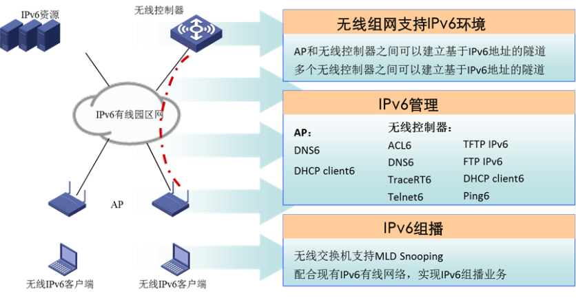 ? IPv6 ACL、IPv6組播——無線網實現IPv6,需要對用戶按照不同策略進行訪問控制;IPv6組播往往是園區IPv6業務的支撐技術;