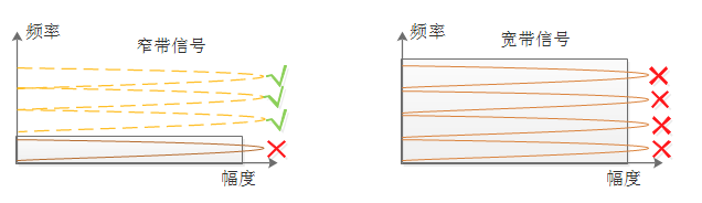 窄帶信號的使用不僅可以降低對網絡中其他系統的影響,同時降低了在頻域上被干擾的概率,如下圖所示:
