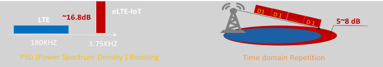 eLTE-IoT通過窄帶頻域占用以適配法規要求,通過提升功率譜密度來提升覆蓋,同時將待發送的數據調制后在多個時域內進行重復發送,在接收機側會將重復的信號進行累積從而獲得更高的信噪比,從而提升靈敏度和覆蓋范圍。最遠可實現10Km的覆蓋能力。