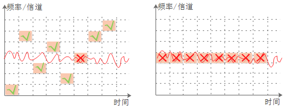 跳頻,通過在多個信道間進行隨機選擇信道進行數據發送,通過跳頻技術可以解決突發的隨機干擾,獲得抗干擾增益。