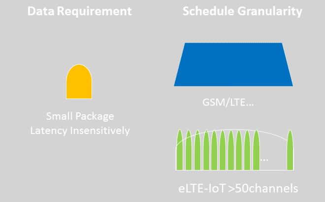 eLTE-IoT提供更小的資源分配粒度,定義了窄帶信道,這樣單位帶寬內可以有更多的上行信道,支持并發,而且為了提供海量鏈接,允許多個用戶復用一個信道;