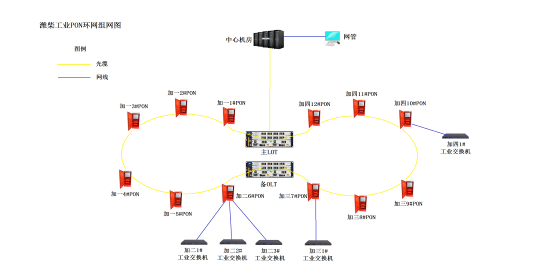 工業(yè)PON網(wǎng)絡(luò)的拓?fù)浣Y(jié)構(gòu)可與各車間信息節(jié)點(diǎn)無縫結(jié)合,可根據(jù)需要組成多鏈路備份的樹形結(jié)構(gòu)、環(huán)形結(jié)構(gòu)等傳送網(wǎng)絡(luò)。網(wǎng)絡(luò)拓?fù)鋱D如下所示: